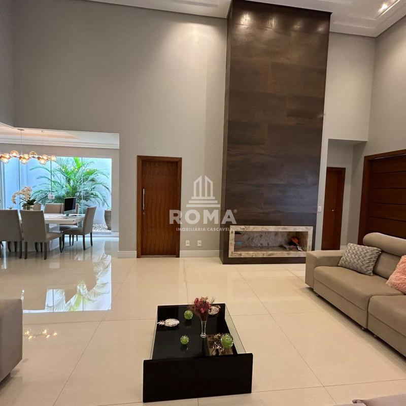 Sala de estar com pé-direito duplo e lareira, traduzindo imponência e aconchego.